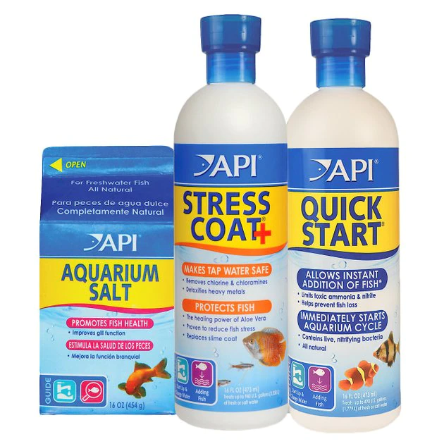 API Quick Start 16 oz, API Stress Coat 16 oz, API Aquarium Salt 16 oz.