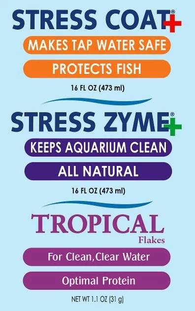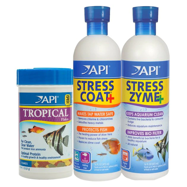 API Stress Coat 16 oz, API Stress Zyme 16 oz, API Tropical Flakes Fish Food 1.1 oz.