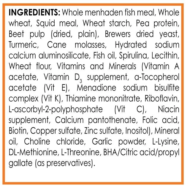 Condensed Fish Protein Digest, Pea Protein, Wheat Starch, Shrimp Meal, Wheat Flour, Fish Oil, Beet Powder, Carrot Powder, Beet Pulp, Dried Molasses, Daphnia, Brewer’s Dried Yeast, Dried Tomato Pomace, Tagetes Meal, Polychaete Worms, Potassium Chloride, Dicalcium Phosphate, Lecithin, Garlic Powder, Dried Seaweed Meal (Fucaceae, Alariaceae, Baniaceae, Palmariaceae), Choline Chloride, Turmeric, L-Ascorbyl-2-Polyphosphate, Honey, Hydrolyzed Yeast, DL-Methionine, A-Tocopherol Acetate, Niacin, Calcium Pantothenate, Zinc Sulfate, Vitamin D3 Supplement, Inositol, Riboflavin Supplement, Thiamine Mononitrate, Pyrodoxine Hydrochloride, BHT (Preservative), Manganese Sulfate, Vitamin A Acetate, Folic Acid, Potassium Iodate, Copper Sulfate, Biotin And Vitamin B12 Supplement.