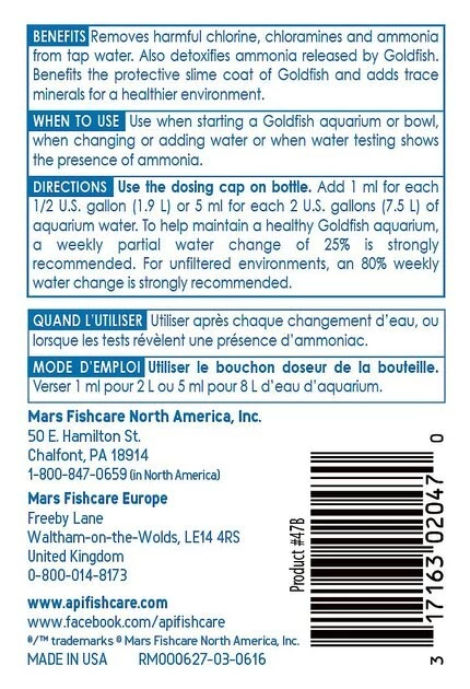 API GOLDFISH PROTECT makes tap water safe for goldfish by removing chlorine and chloramines. It also detoxifies ammonia released by goldfish.