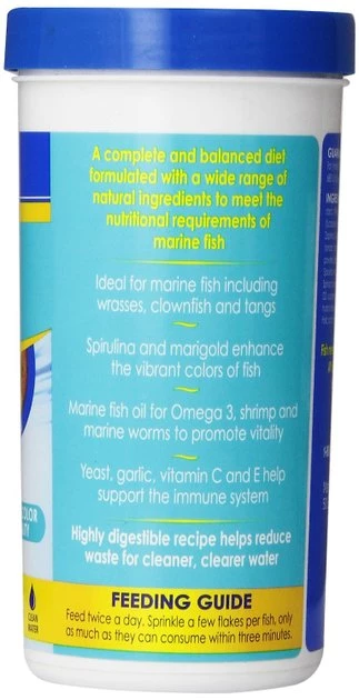 - Complete and balanced diet for all marine fish including Clownfish, Wrasses and Tangs in flake form.