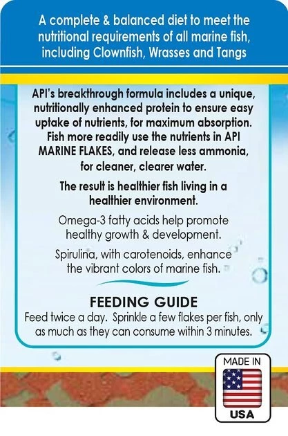 Feed your Clownfish, Wrasses, Tangs and other marine fish a complete and balanced diet that also leaves water cleaner and clearer with API Marine Optimal Protein Flakes. This healthy diet produces up to 30% less ammonia than leading competitor foods because it’s made with nutritionally enhanced protein for maximum digestion. The more nutrients your fish digests, the less waste and ammonia is produced. It also contains omega-3 fatty acids to promote healthy growth and development and spirulina to enhance the vibrant colors of marine fish. Feed twice a day, and provide only as much as your fish will consume within three minutes.