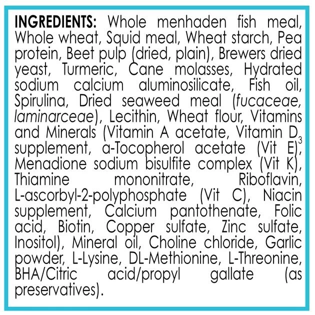 Whole menhaden fish meal, Whole wheat, Squid meal, Wheat starch, Pea protein, Beet pulp (dried, plain), Brewers dried yeast, Turmeric, Cane molasses, Hydrated sodium calcium aluminosilicate, Fish oil, Spirulina, Dried seaweed meal (fucaceae, laminarceae), Lecithin, Wheat flour, Vitamins and Minerals (Vitamin A acetate, Vitamin D3 supplement, a-Tocopherol acetate (Vit E), Menadione sodium bisulfite complex (Vit K), Thiamine mononitrate, Riboflavin, L-ascorbyl-2-polyphosphate (Vit C), Niacin supplement, Calcium pantothenate, Folic acid, Biotin, Copper sulfate, Zinc sulfate, Inositol), Mineral oil, Choline chloride, Garlic powder, L-Lysine, DL-Methionine, L-Threonine, BHA/Citric acid/propyl gallate (as preservatives).