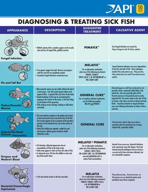 Many disease symptoms will be clearly visible, such as white streaks, lesions, protruding eyes, and other unusual marks or spots on your fish. If you suspect your fish has a disease, it will fall under the categories of fungal, parasitic, or bacterial. One way to diagnose is by matching fish symptoms to the description of a wide range of API medications, which include treatments specific to Ich disease, Betta fish, and various common symptoms (hole-in-the-head, eye cloud, fin & tail rot, etc.)