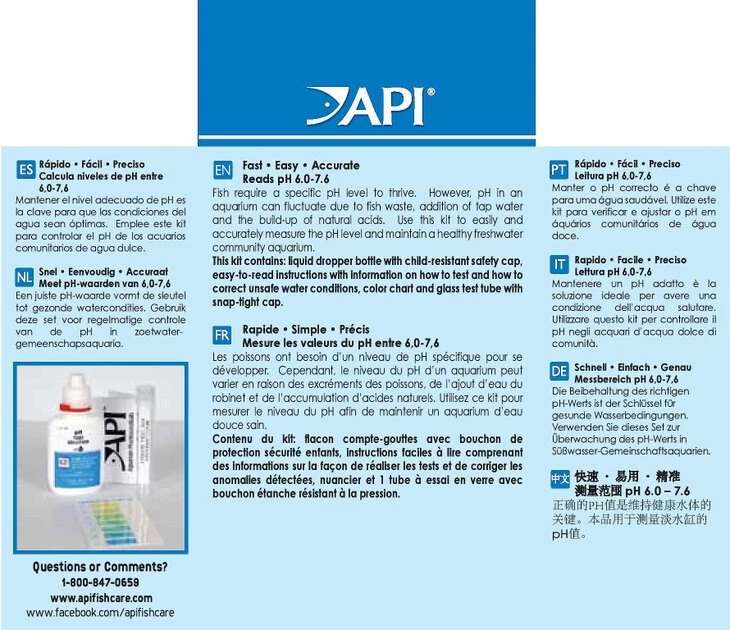Easily and accurately measure the pH level to maintain a healthy freshwater aquarium with API pH Freshwater Aquarium Test Kit. Fish require a specific pH level to thrive. Waste, uneaten food and tap water can change pH levels and create harmful conditions for your fish and plants. This kit measures pH range from 6.0 to 7.6 and comes with pH test solution, glass test tube and easy-to-read pH color chart. Just fill the test tube with water, add a few drops of test solution and compare results with the color chart. Then follow the recommendations on the chart if any action needs to be taken. Test weekly to maintain a healthy balance.