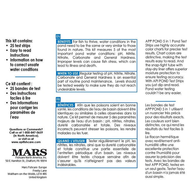Get a fast, accurate reading of your pond’s water condition with API’s Pond 5-IN-1 Test Strips. Routine pond maintenance is the key to keeping the water condition as close to your finned friends’ natural habitat as possible. Safe for both freshwater and saltwater, these strips measure pH, nitrite, nitrate, carbonate hardness and general hardness with a single strip. With distinct color variation on the strips, the results are easy to read. And there’s no need for separate test vials—just dip a strip into the water and use the precise color charts to determine each level. A special liner inside the container keeps the test strips dry until they are ready to be used.