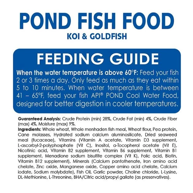When water temperature is above 60°F: feed your fish 2 or 3 times a day. Only feed them as much as they will eat within 5 to 10 minutes. When the water temperature is between 41°-65°F feed your fish API Pond Cool Water Fish Food, designed for better digestion in cooler temperatures.