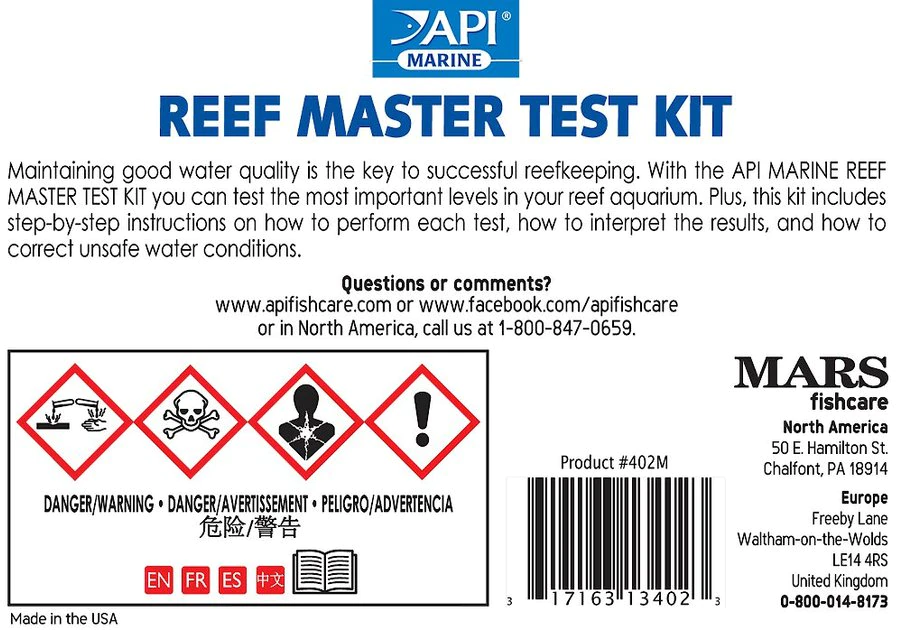 Measure the most important reef aquarium levels including calcium, carbonate hardness, phosphate and nitrate with API’s Reef Aquarium Master Test Kit. Proper balance is key to the overall health of reef inhabitants. Corals and reef invertebrates like shrimp, crabs and encrusting algae require calcium to grow and proper levels of carbonate hardness to prevent harmful fluctuations in pH. Excess phosphate, which comes from fish waste, uneaten food and other decaying organic matter as well as tap water, can cause algae blooms and affect healthy growth of hard corals. High nitrate levels from fish waste and organic compounds can cause fish disease and algae blooms. This API test kit comes with four different tests that are specifically calibrated to measure these levels in reef aquariums. Just fill the test tubes, add the test drops and compare results to the color card. Then follow the recommendations on the card if needed.
