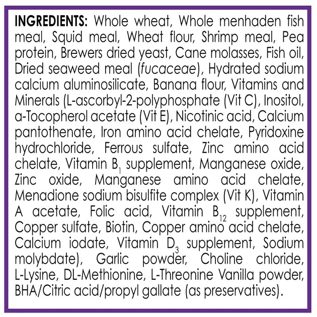 Whole Wheat, Whole Menhaden Fish Meal, Squid Meal, Wheat Flour, Shrimp Meal, Pea Protein, Brewers Dried Yeast, Cane Molasses, Fish Oil, Dried Seaweed Meal (Fucaceae), Hydrated Sodium Calcium Aluminosilicate, Banana Flour, Vitamins And Minerals (L-Ascorbyl-2-Polyphosphate (Vitamin C), Inositol, A-Tocopherol Acetate (Vitamin E), Nicotinic Acid, Calcium Pantothenate, Iron Amino Acid Chelate, Pyridoxine Hydrochloride, Ferrous Sulfate, Zinc Amino Acid Chelate, Vitamin B1 Supplement, Manganese Oxide, Zinc Oxide, Manganese Amino Acid Chelate, Menadione Sodium Bisulfite Complex (Vitamin K), Vitamin A Acetate, Folic Acid, Vitamin B12 Supplement, Copper Sulfate, Biotin, Copper Amino Acid Chelate, Calcium Iodate, Vitamin D3 Supplement, Sodium Molybdate), Garlic Powder, Choline Chloride, L-Lysine, DL-Methionine, L-Threonine Vanilla Powder, BHA/Citric Acid/Propyl Gallate (as Preservatives).