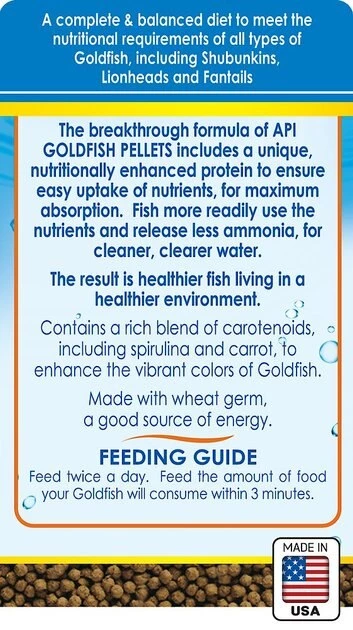 Feed your Goldfish a protein-rich diet scientifically formulated to promote healthy growth and cleaner, clearer water with API Optimal Protein Sinking Pellets Goldfish Food. This complete and balanced diet is ideal for all types of Goldfish including Shubunkins, Lionheads and Fantails. It contains nutritionally-enhanced protein for maximum digestion and produces up to 30% less ammonia. The more nutrients your fish digests, the less waste and ammonia are released, leaving cleaner, clearer water. Plus, these pellets contain a rich blend of carotenoids including spirulina and carrot to enhance color and wheat germ for energy. Feed twice a day, and provide only as much as your fish will eat within three minutes.