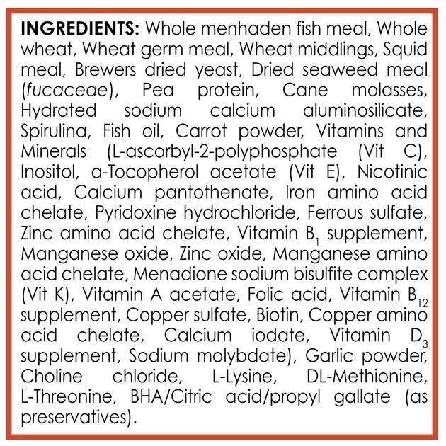 Whole menhaden fish meal, Whole wheat, Squid meal, Wheat starch, Pea protein, Beet pulp (dried, plain) Brewers dried yeast, Turmeric, Cane molasses, Hydrated sodium calcium aluminosilicate, Fish oil, Spirulina, Dried seaweed meal (fucaceae, laminarceae), Lecithin, Wheat flour, Vitamins and Minerals (Vitamin A acetate, Vitamin D3 supplement, a-Tocopherol acetate (Vit E), Menadione sodium bisulfite complex (Vit K), Thiamine mononitrate, Riboflavin, L-ascorbyl-2-polyphosphate (Vit C), Niacin supplement, Calcium pantothenate, Folic acid, Biotin, Copper sulfate, Zinc sulfate, Inositol), Mineral oil, Choline chloride, Garlic powder, L-Lysine, DL-Methionine, L- Threonine, BHA/Citric acid/propyl gallate (as preservatives).