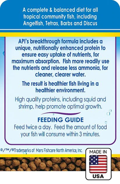 Feed your tropical fish a protein-rich diet scientifically formulated to promote healthy growth and cleaner, clearer water with API Optimal Protein Sinking Pellets Tropical Fish Food. It’s a complete and balanced diet ideal for tropical community fish including Angelfish, Tetras, Barbs and Discus. These flakes contain nutritionally-enhanced protein for maximum digestion and produce up to 30% less ammonia. The more nutrients your fish digests, the less waste and ammonia are released, leaving cleaner, clearer water. Plus, they are made with squid and shrimp for optimal growth and garlic for added palatability. Feed twice a day, and provide only as much as your fish will eat within three minutes.