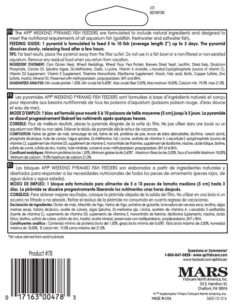 API VACATION PYRAMID FISH FEEDER should be used as a temporary substitute for daily feeding for your fish while you are away on vacation. This block, which contains a highly nutritious formula, is designed to slowly release the proper amount of food to your fish each day you are gone. This eliminates the risk of friends or neighbors overfeeding the fish, which can lead to harmful ammonia spikes in your tank. This particular feeder lasts up to 14 days, but may pollute water if your tank is left completely unattended for this length of time. Use as directed.