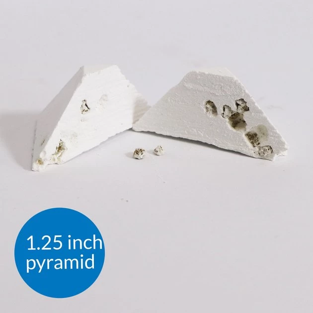 1 pyramid is formulated to feed 5 – 10 fish (average length 2″) for up to 14 days. The pyramid dissolves slowly, releasing food after a few hours.