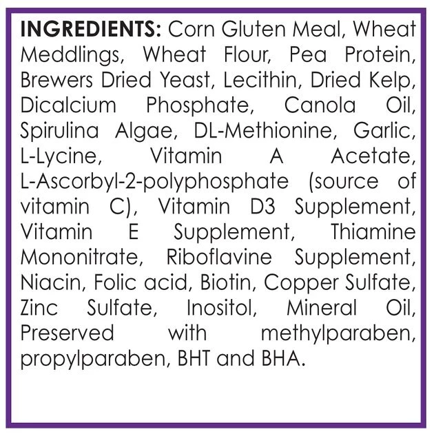 Corn Gluten Meal, Wheat Middlings, Wheat Flour, Pea Protein, Brewers Dried Yeast, Lecithin, Dried Kelp, Dicalcium Phosphate, Canola Oil, Spirulina Algae, DL-Methionine, Garlic, L-Lysine, Vitamin A Acetate, L-Ascrorbyl-2-polyphosphate (source of Vitamin C), Vitamin D3 Supplement, Vitamin E Supplement, Thiamine Mononitrate, Riboflavin Supplement, Niacin, Folic Acid, D-Biotin, Copper Sulfate, Zinc Sulfate, Inositol, Mineral Oil, preserved with Methylparaben, Propylparaben, BHT, and BHA.