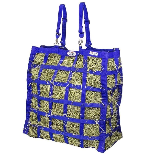 Teach your mane man some manners with the Derby Originals Easy-Feed Patented Four-Sided Slow Feed Horse Hay Bag. This hay bag for slow-feeding horses is tailored to meet the needs of equines, livestock and more. It is crafted to allow animals to eat from any side with its exclusive patented design. The slow-feed hay bag for horses is built to support healthy digestion by replicating natural grazing patterns and slowing the rate of consumption. It is constructed using super-tough double-layered 1200D nylon with reinforced stitching and strong straps. It is equipped with three-inch by three and a half-inch rectangular openings and premium hardware for your pony pal.