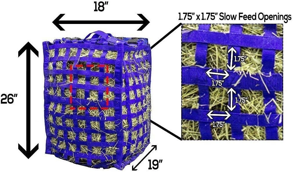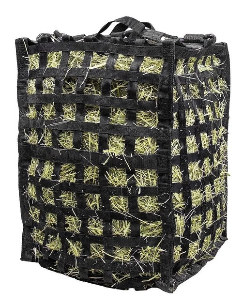 Slow down your companion’s consumption with the Derby Originals Natural Grazer Patented Four-Sided Slow Feed Horse Hay Bag. This all natural slow-feed hay bag for horses features premium hardware. It is crafted to hold approximately ¾ of a bale of hay and is equipped with top and bottom handles for easy lifting. This horse hay bag features an exclusive patented four-sided design that allows your horse to eat comfortably from any angle, while supporting natural grazing patterns and healthy digestion. It is constructed using heavy-duty double layered 1200D nylon with two-inch square openings for your amigo.