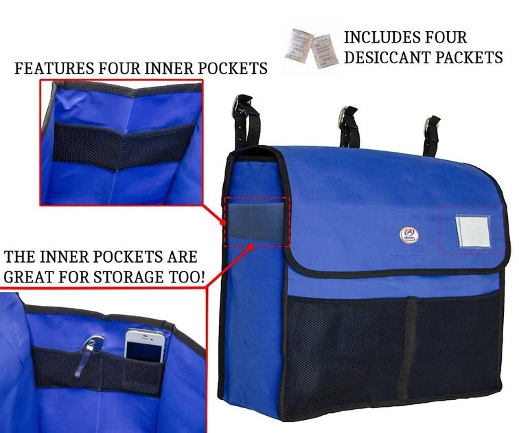 - Features four inside pockets for storage containing silica gel desiccant bags.
