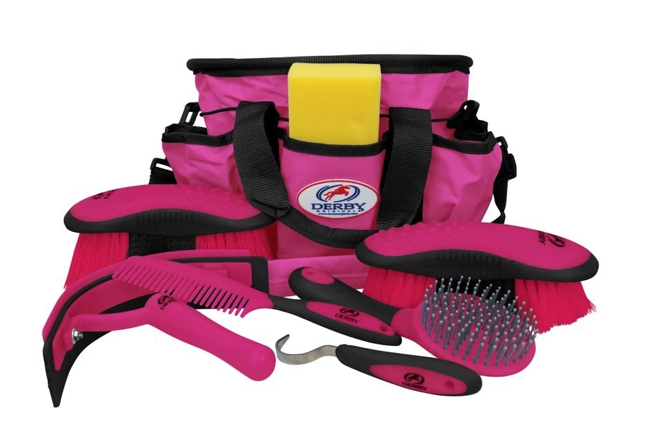 - Contains nine items including a matching carry bag, a bathing sponge, sweat scraper, hoof pick, mane and tail comb and brush, a dandy brush and a soft brush.