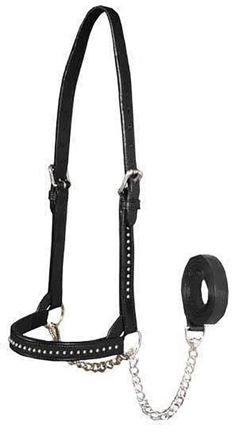 Help your bovine buddy win a blue ribbon with the Derby Originals Premium Show Spotted Flat Leather Cattle Show Halter & Chain Lead. This spotted leather halter for cows is built to be show-ring ready. It features shiny stainless show spots that elegantly contrast the dark leather. This cattle halter is ideal for 4H-ers and is designed for long-lasting durability. It includes a matching one-inch wide by 48-inch long leather lead and a 14-inch heavy-duty nickel-plated control chain for your hooved buddy.