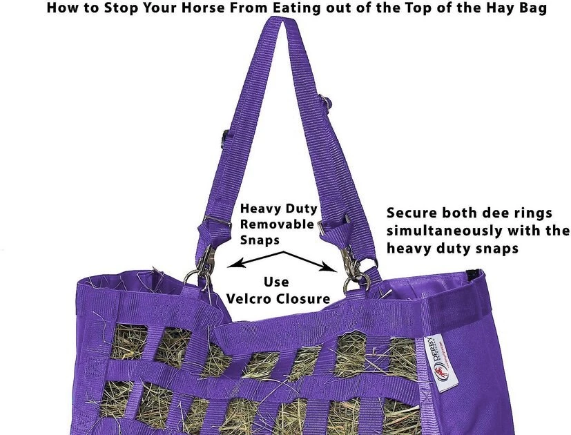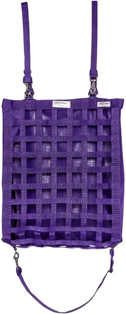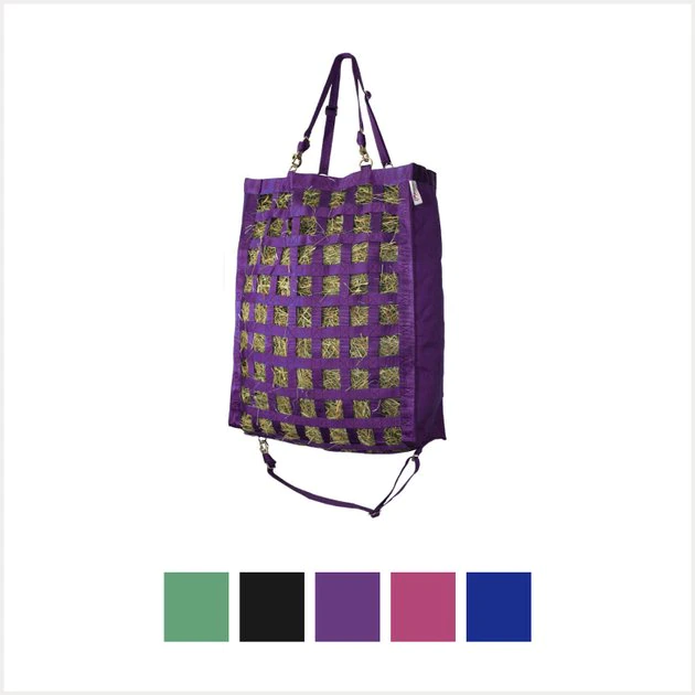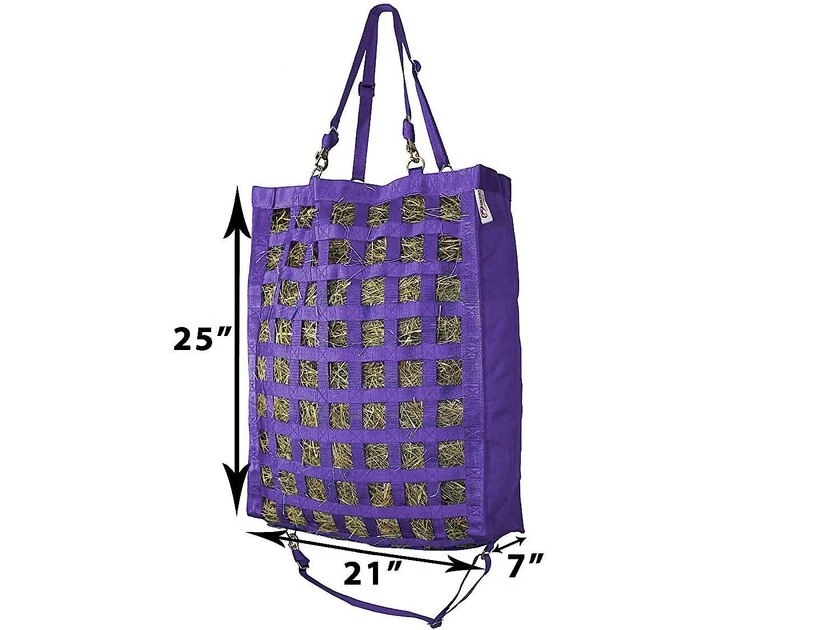 - Easily holds two flakes of hay and is perfect for use in the stable, in the trailer or at a show; bag measures 25 x 21 x 7 inches and is available in five colors.