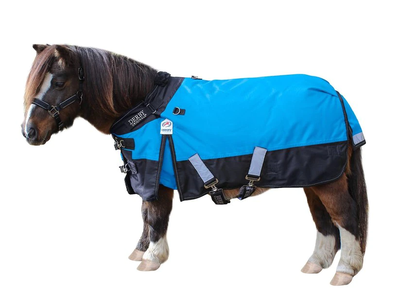Save your mane man from the rain with Derby Originals Windstorm Series 1200D Ripstop Waterproof Mini/Pony Horse Rain Sheet. This rain sheet for mini horses features a modern contoured design that’s comfortable and durable. It is equipped with quick-clip double chest buckles and adjustable neck straps for just the right fit. This innovative mini horse rain sheet is constructed for all-season use to keep your horse warm in the winter and cool in the summer. It’s crafted to be reflective for safety and is ideal for use both indoors and outdoors.