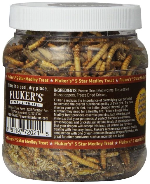 Fluker’s 5 Star Medley Freeze-dried Bearded Dragon Treats are nutritional snacks packed with variety for your reptile’s diet. These treats provide essential proteins, fats, vitamins and minerals for complete and balanced nutrition. 5 Star Medley is a perfect blend of freeze-dried mealworms, grasshoppers and crickets, which eliminates the hassle of dealing with live prey items and ensures your dragon will accept and love this treat.