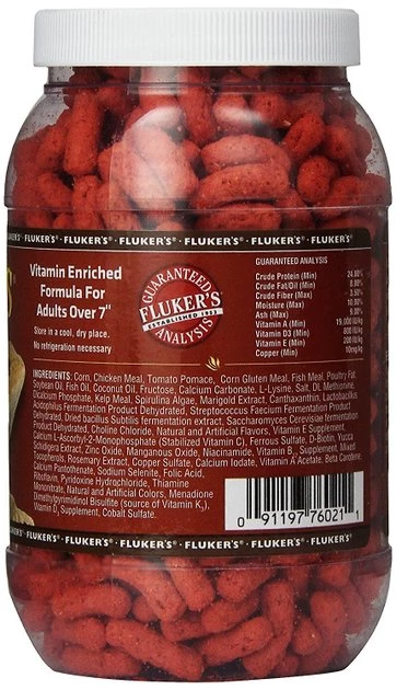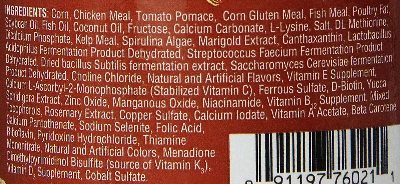 Corn, Chicken Meal, Tomato Pomace, Corn Gluten Meal, Fish Meal, Poultry Fat, Soybean Oil, Fish Oil, Coconut Oil, Fructose, Caldium Carbonate, L-Lysine, Salt, Dla Methionine, Dicalcium Phosphate, Kelp Meal, Spirulina Algae, Marigold Extract, Canthaxanthin, Lactobacillus, Acidophilus Fermentation Product Dehydrated, Streptococcus Faecium Fermentation Product Dehydratedf, Dried Bacillus Subtilis Fermentation Extract. Saccharomyces Cerevisiae Fermentation Product Dehydrated, Choline Chloride, Natural and Artificial Flavors, Vitamin E Supplement, Calcium L-Ascorbyl-2-Monophosphate (Stabilized Vitamin C), Ferrous Sulfate, D-Biotin, Yucca Schidigera Extract, Xinc Oxide, Manganous Oxide, Niacinamide, Vitamin B 12 Supplement, Mixed Tocopherols, Rosemary Exract, Copper Sulfate, Calcium Iodate, Vitamin A Acetate, Beta Carotene, Calcium Pantothenate, Sodium Selenite, Folic Acid, Riboflavin, Pyridoxine Hydrochloride, Thiamine Mnonitrate, Natural and Artificial Colors, Menadione Dimethylprimidinol Isulfite (Source of Vitamin K3) Vitamin D3, Supplement, Cobalt Sulfate.