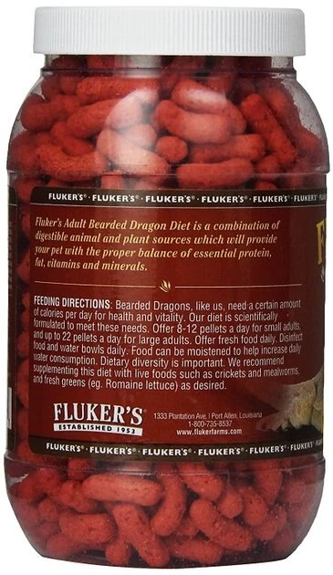Fluker’s Adult Bearded Dragon Diet Reptile Food is made with unique textured pellets that beardeds love to eat. Bearded dragons need a certain amount of calories per day for optimal health and vitality and this diet is scientifically formulated to meet their needs. It’s vitamin-enriched and designed for adults over 7″, combining digestible animal and plant sources to provide your pet with the proper balance of essential protein, fat, vitamins and minerals.