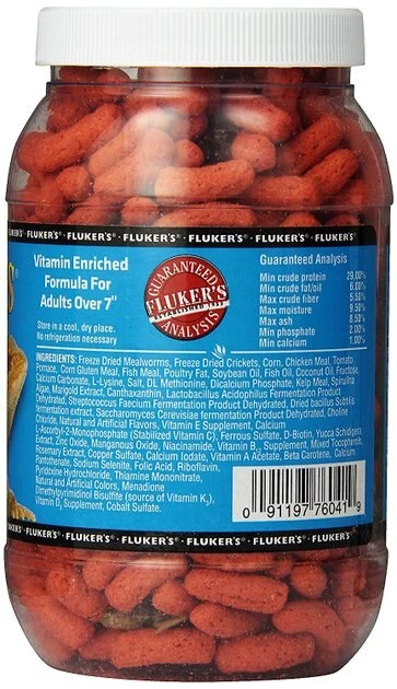Freeze Dried Mealworms, Freeze Dried Crickets, Corn, Chicken Meal, Tomato Pomace, Corn Gluten Meal, Fish Meal, Poultry Fat, Soybean Oil, Fish Oil, Coconut Oil, Fructose, Calcium Carbonate, L-Lysine, Salt, Dl-Methionine, Dicalcium Phosphate, Kelp Meal, Spirulina Algae, Marigold Extract, Canthaxanthin, Lactobacillus Acidophilus Fermentation Product Dehydrated, Streptococcus Faecium Fermentation Product Dehydrated, Dried Bacillus Subtilis Fermentation Extract, Saccharomyces Cerevisiae Fermentation Product Dehydrated, Choline Chloride, Natural and Artificial Flavors, Vitamin E Supplement, Calcium L-Ascorbyl-2-Monophosphate (Stabilized Vitamin C), Ferrous Sulfate, D-Biotin, Yucca Schidigera Extract, Zinc Oxide, Manganous Oxide, Niacinamide, Vitamin B12 Supplement, Mixed Tocopherols, Rosemary Extract, Copper Sulfate, Calcium Iodate, Vitamin A Acetate, Beta Carotene, Calcium Pantothenate, Sodium Selenite, Folic Acid, Riboflavin, Pyridoxine Hydrochloride, Thiamine Mononitrate, Natural and Arti, Ficial Colors, Menadione Dimethylpyrimidinol Bisulfite (Source of Vitamin K3), Vitamin D3 Supplement, Cobalt Sulfate.