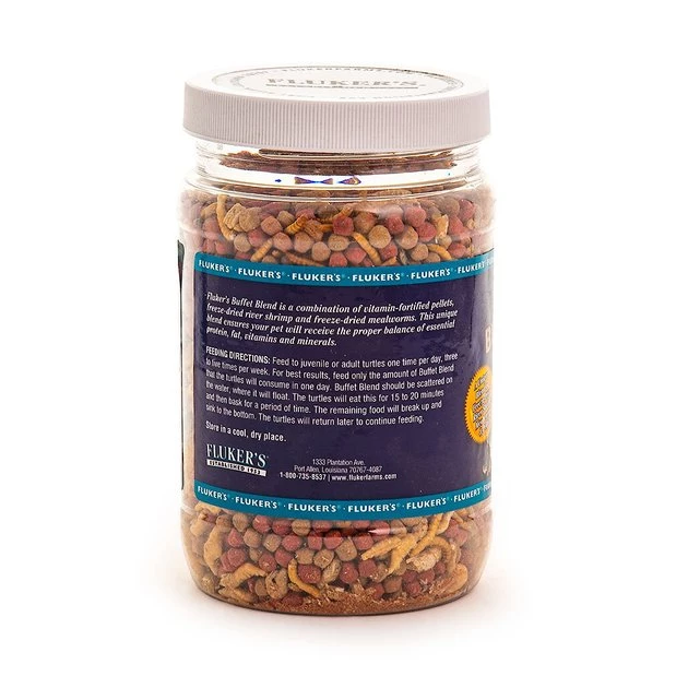 It’s extremely important that our shelled friends get all the vitamins and minerals they need—that’s where Fluker’s Buffet Blend for Aquatic Turtles comes in. This combination of vitamin-fortified pellets, freeze dried river shrimp, and freeze dried mealworms ensures your aquatic turtle is well-fortified. The proper blend of essential protein, fat, vitamins, and minerals is all packed into a balanced, easy-to-feed pellet.
