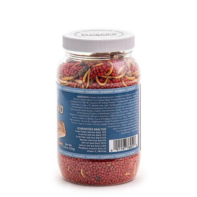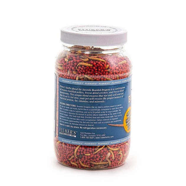 Fluker’s knows how important it is for reptiles to get a nutritious diet, so their Buffet Blend Juvenile Bearded Dragon Food is packed with all the essential nutrients and vitamins your pet needs. This formula is for juveniles under 7″ and contains a combination of freeze-dried crickets and freeze-dried mealworms plus vitamin-enriched pellets to provide a complete and balanced meal with instant nutritional variety for your bearded. The unique blend ensures your pet receives the proper balance of essential protein, fat, vitamins and minerals.