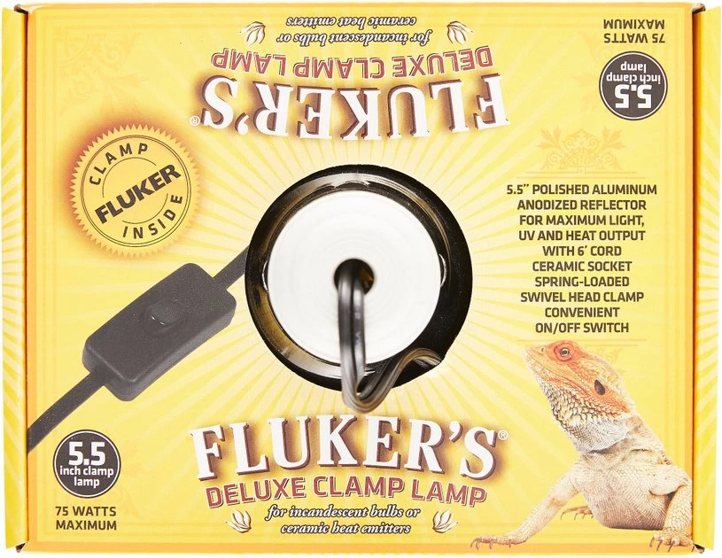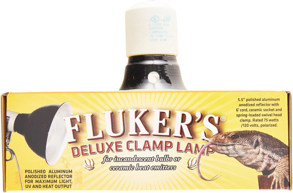 Fluker’s Ceramic Repta-Clamp Lamp with Switch is the perfect addition to your reptile’s terrarium, with all the features and quality you’d expect from Fluker’s. This 5.5″ diameter, reflective lamp is made of heavy-gauge, painted aluminum. Its integrated ceramic socket can be used with incandescent bulbs, ceramic heat emitters and compact fluorescent bulbs, up to 75 watts. And the spring-loaded swivel head clamp securely attaches to the rim of any terrarium.