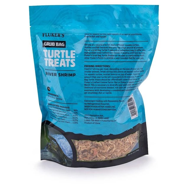Treats aren’t just for furry friends—bring home Fluker’s Grub Bag Turtle Treats – River Shrimp, and your shelled buddies will love you for it. This protein-rich, all-natural treat is designed specifically for aquatic turtles, but is also a fan favorite of terrestrial and semi-aquatic amphibians, tropical fish—and many species of reptile. The secret recipe? An all-natural blend of tasty treat foods featuring river shrimp.