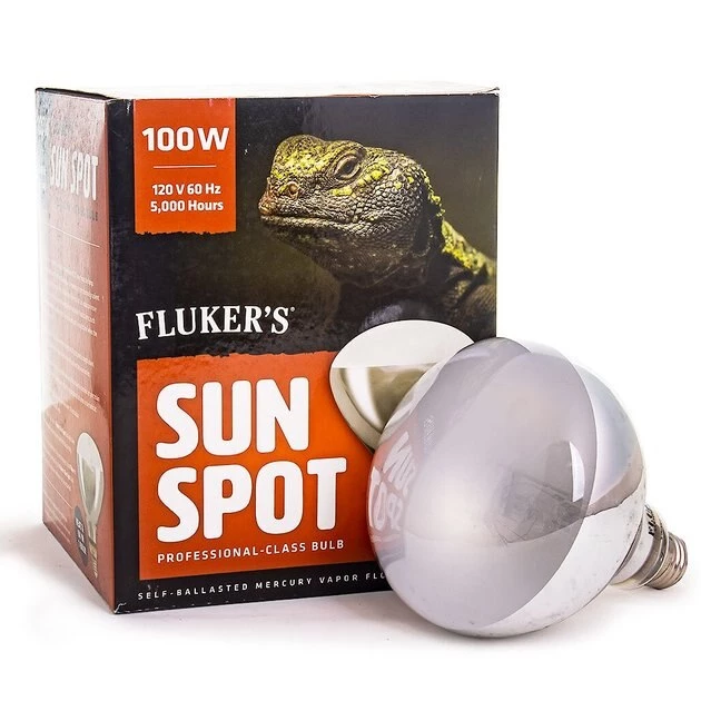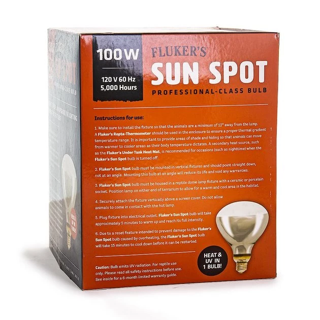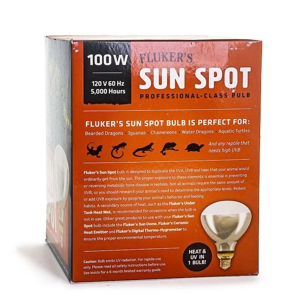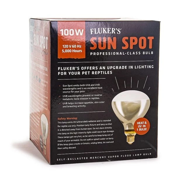 Fluker’s Sun Spot Bulb emits an ideal ratio of both UVA and UVB wavelengths, providing an excellent source of light and heat for your reptile or amphibian. Special UV-transmitting glass ensures optimum light and heat output, at 100 watts. It prevents, and can even reverse, metabolic bone disease in reptiles and helps to increase appetite, color and breeding activity. With a 5,000-hour average life, the Sun Spot bulb will keep your pet healthy and happy for quite a long time before needing to be replaced.