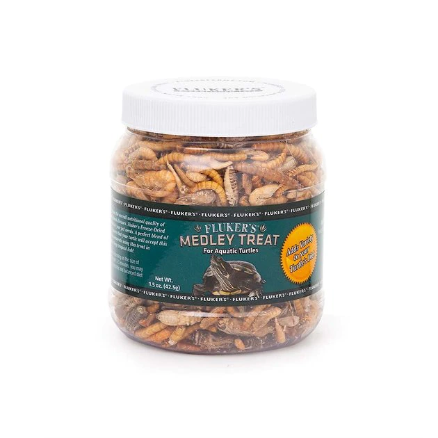 - Fluker’s 5 Star Medley Freeze-Dried Aquatic Turtle Treats—Vitamin enriched formula that provides essential proteins, fats, vitamins and minerals